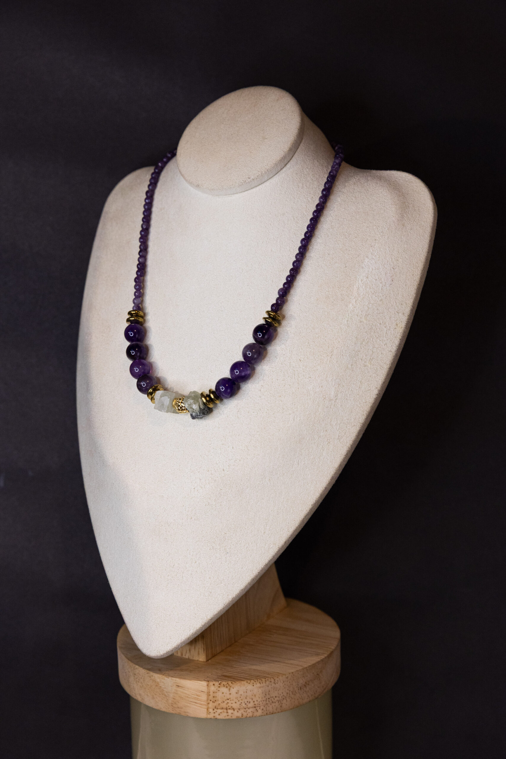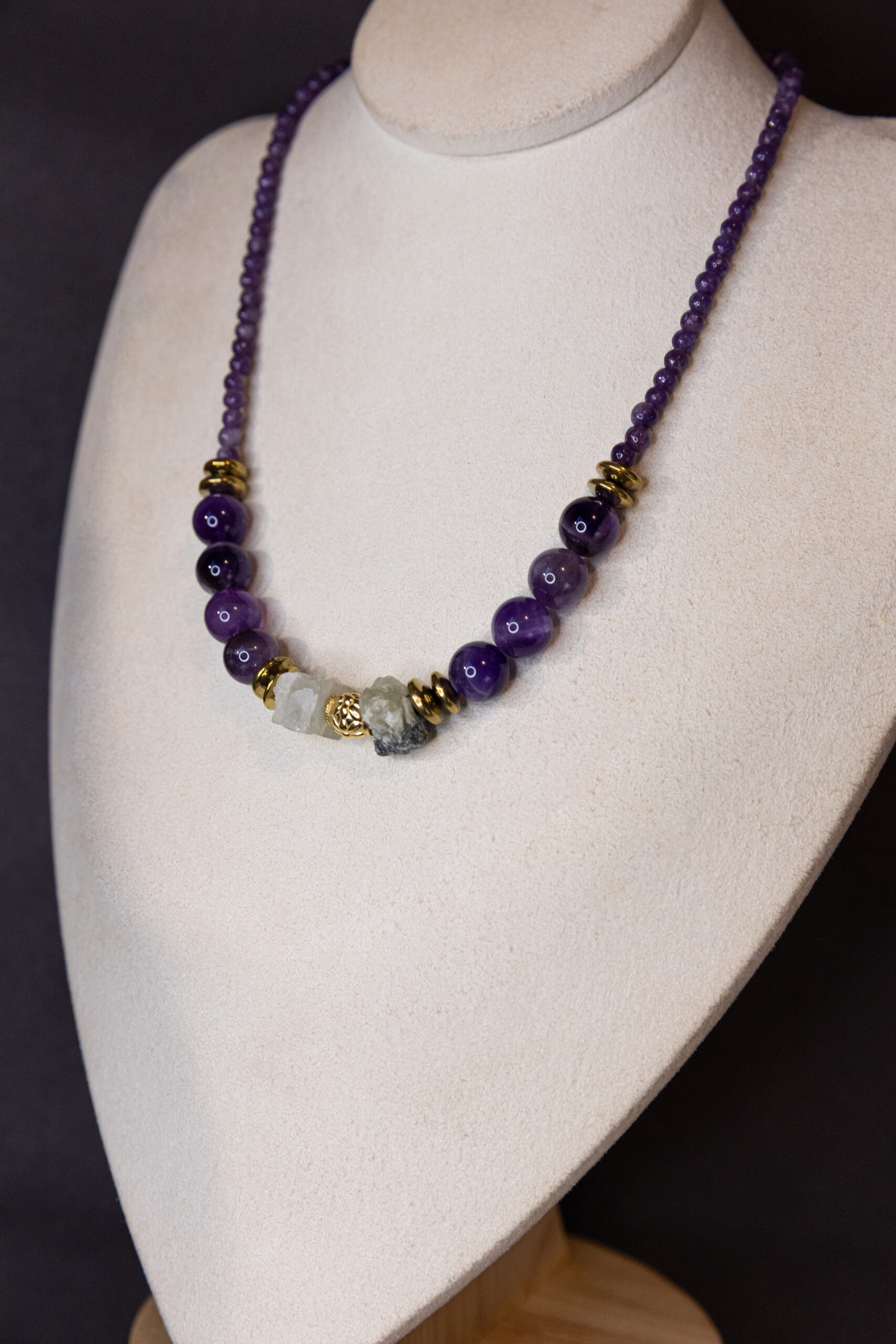 Un collier raffiné et lumineux composé de perles rondes en pierres naturelles violettes, aux reflets profonds et apaisants.