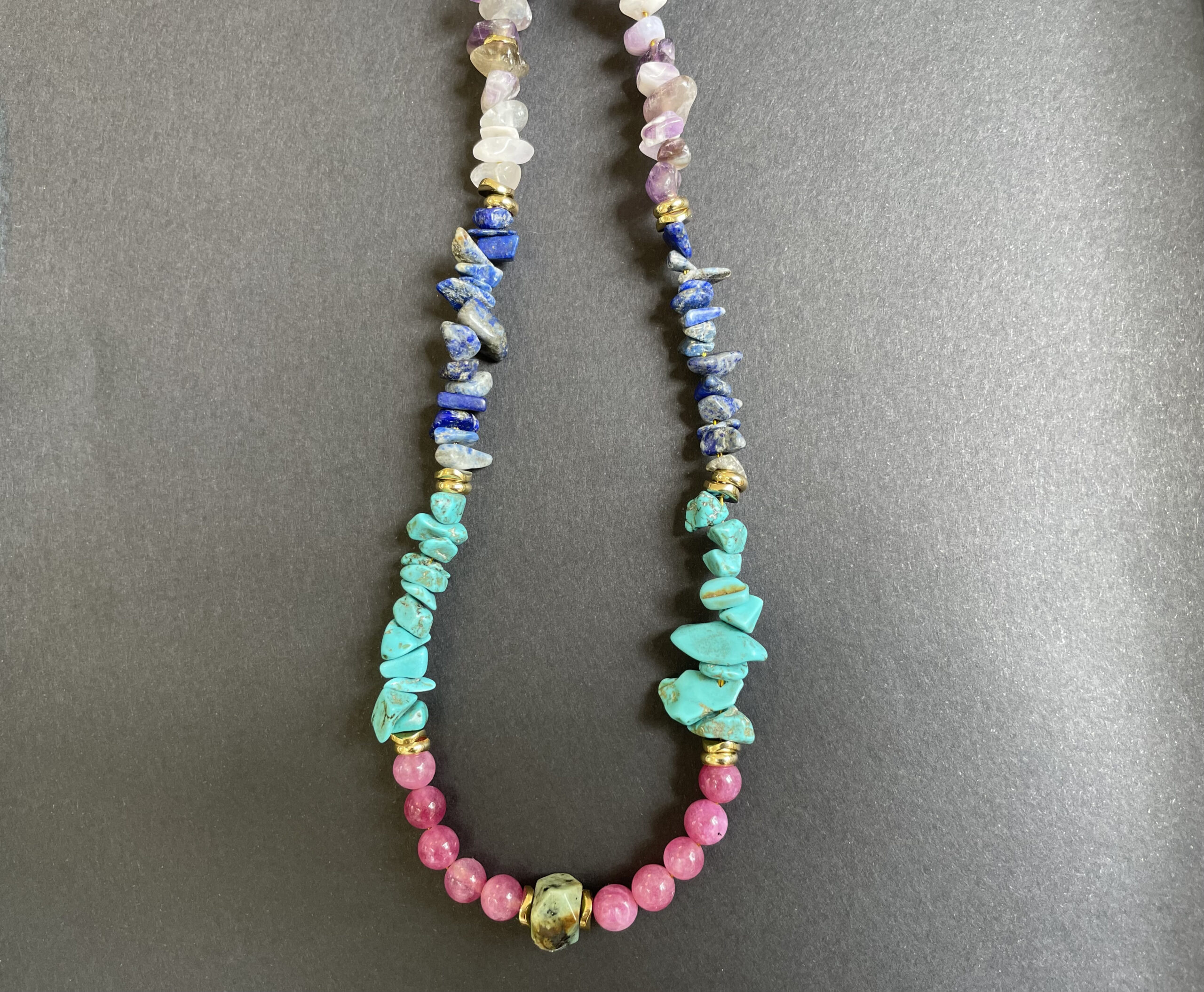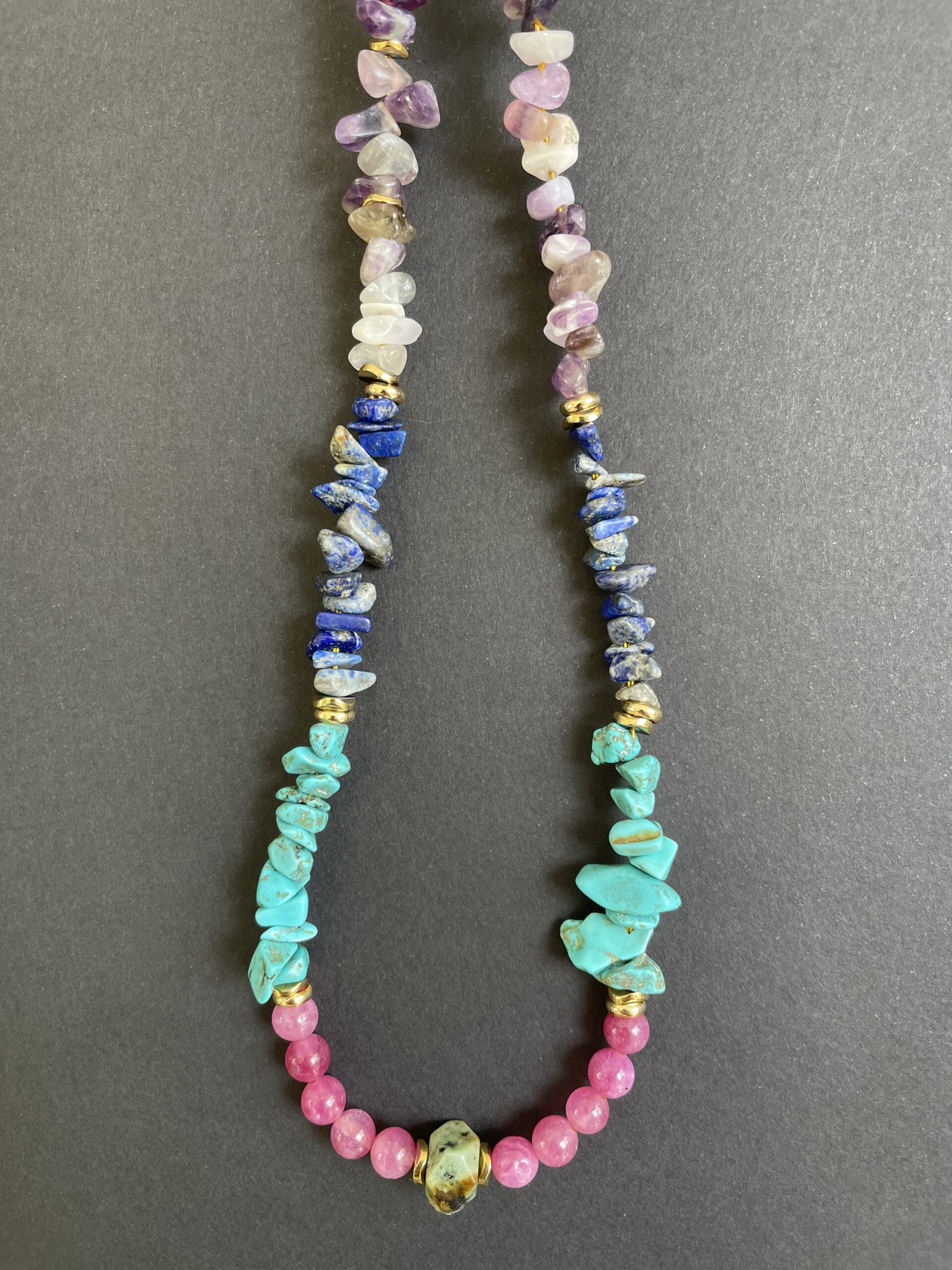 Collier artisanal composé de pierres naturelles aux multiples nuances : rose, turquoise, bleu, violet et vert. Une pièce vibrante et colorée, symbole d’harmonie et de vitalité.