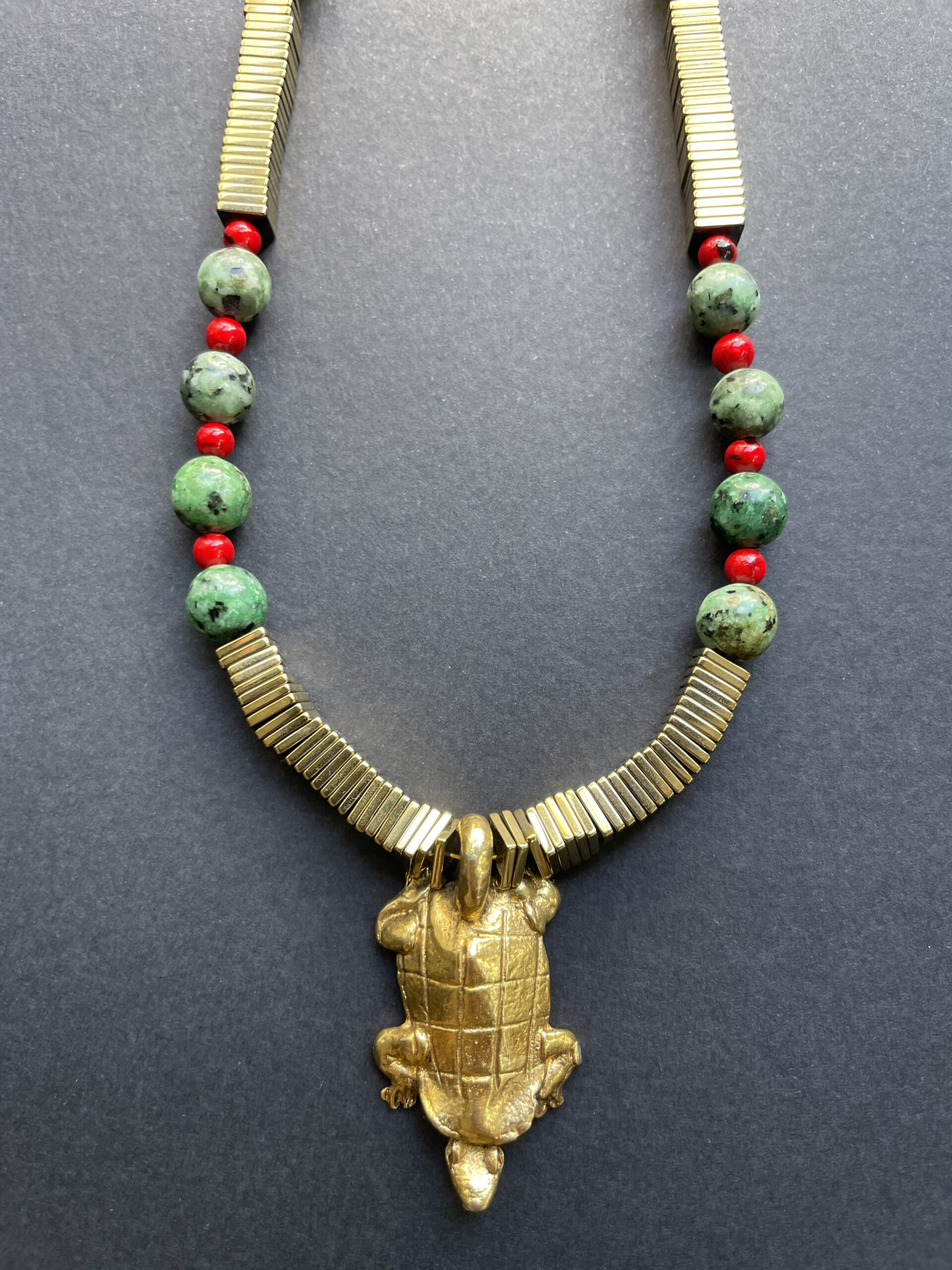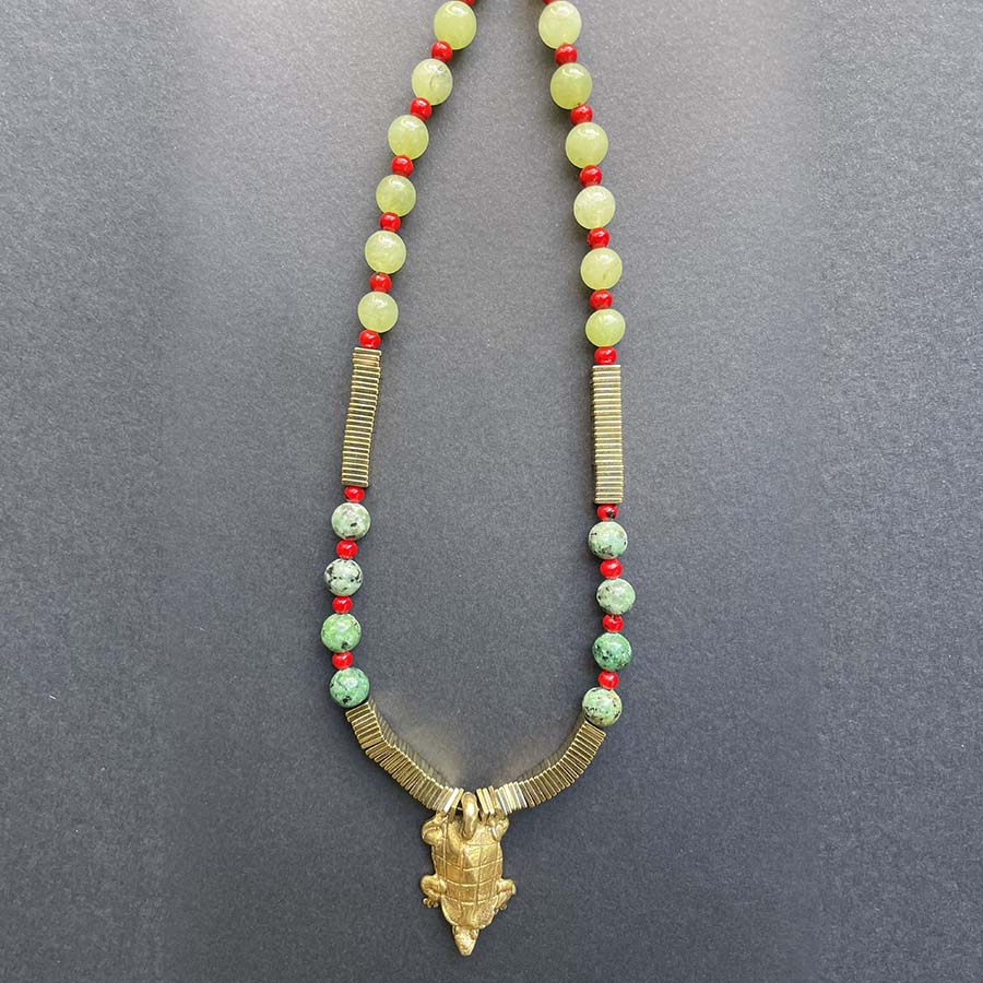 Collier artisanal composé de pierres naturelles vertes et rouges, associé à des éléments dorés et orné d’un pendentif tortue. Une création énergique et harmonieuse, inspirée des couleurs de la nature.