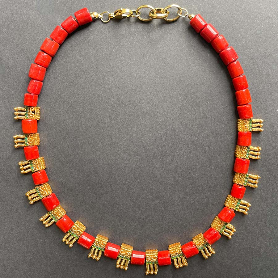 Collier artisanal au style affirmé, confectionné à la main avec des perles naturelles rouges et des éléments dorés décoratifs. Une pièce vibrante qui apporte caractère et intensité à vos tenues.