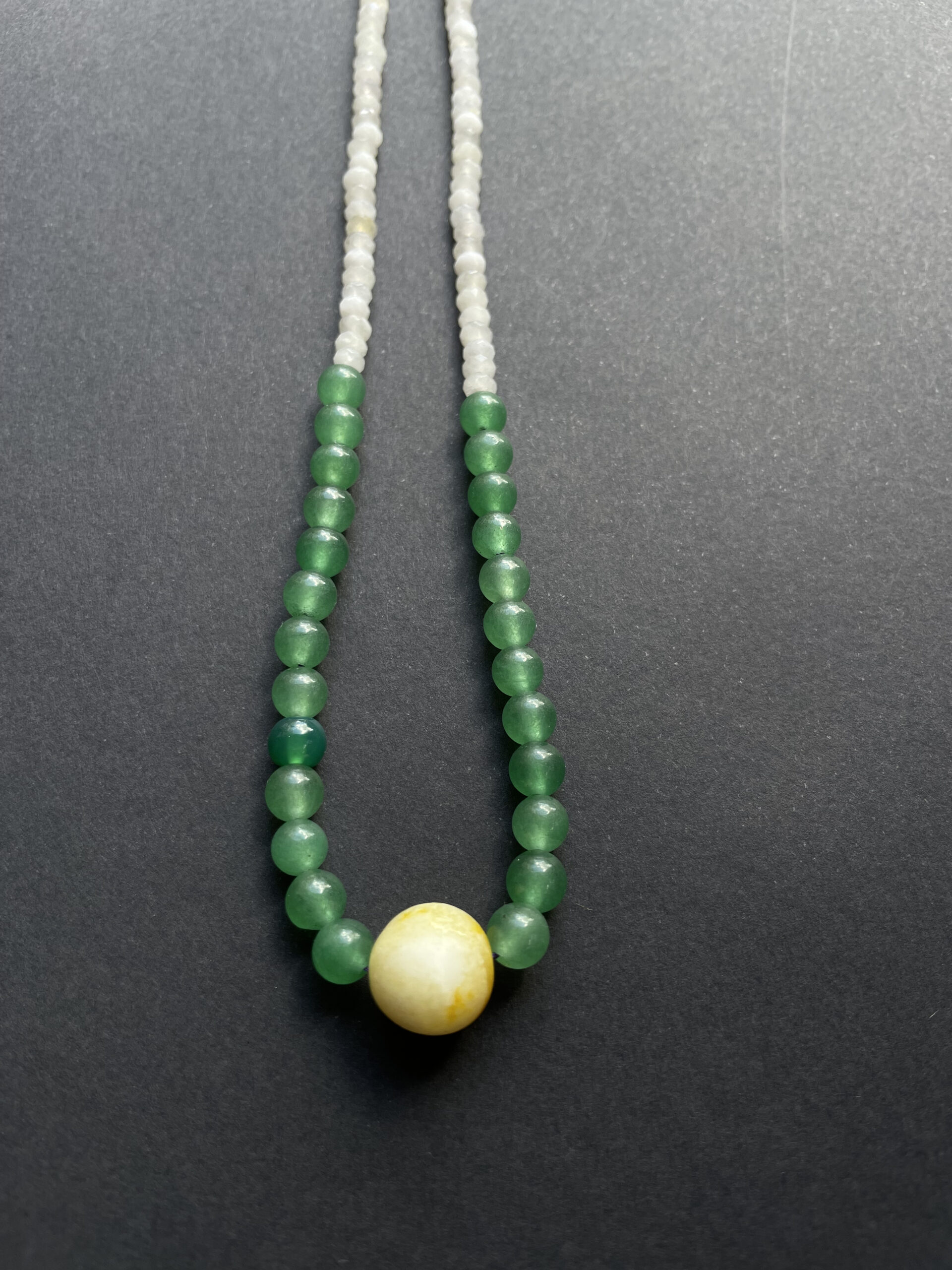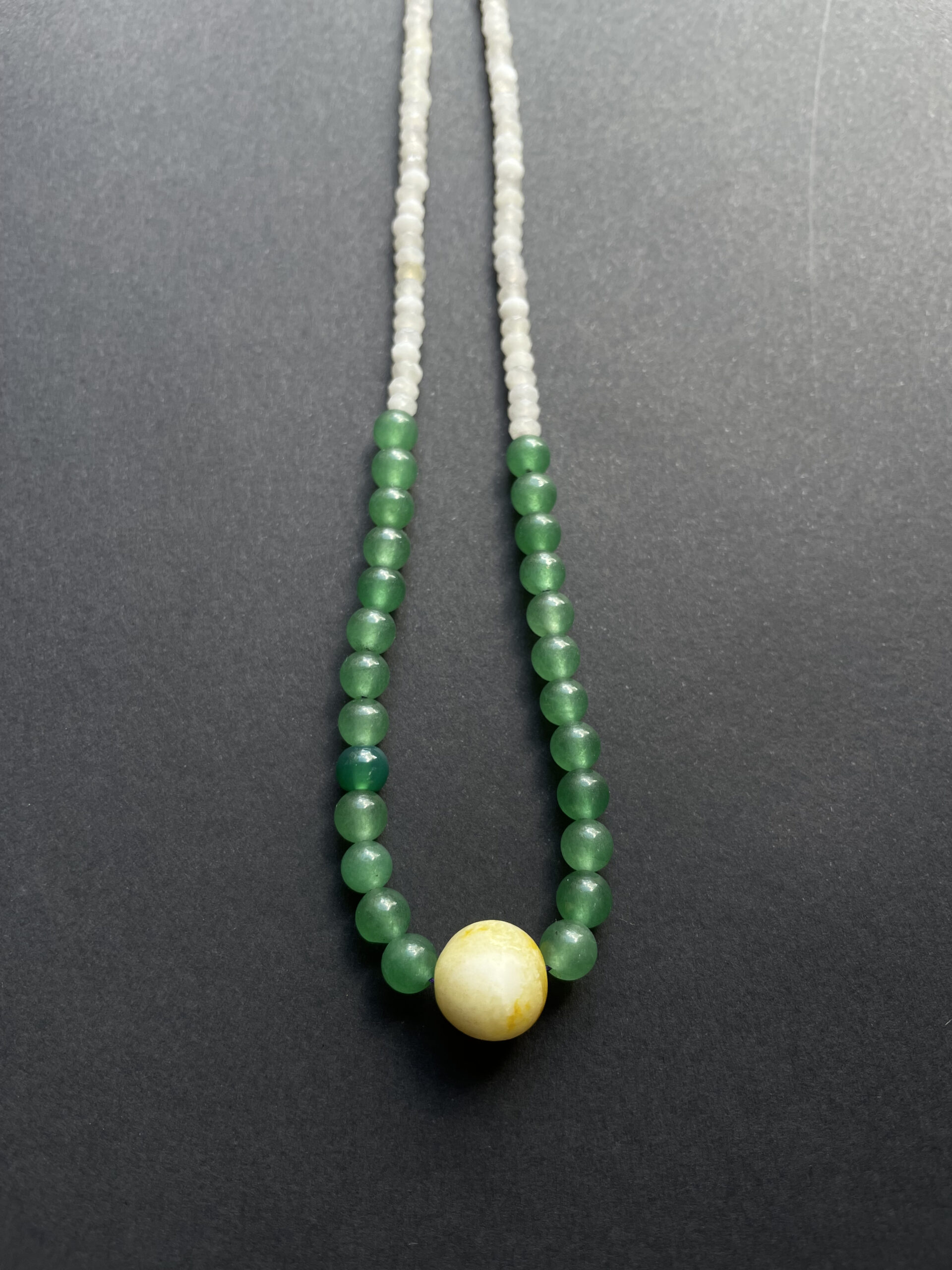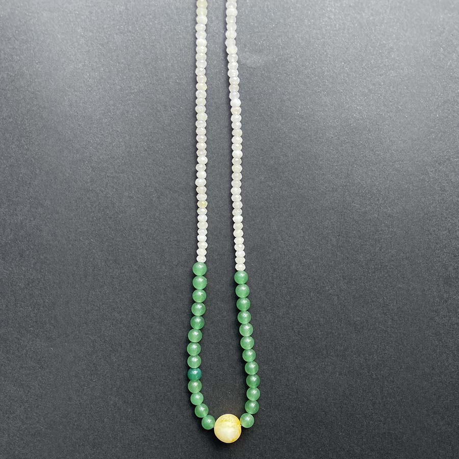 Collier artisanal en pierres naturelles alliant des nuances de vert apaisant et de blanc lumineux, sublimé par une perle centrale jaune solaire. Une création qui capture l’esprit des îles, entre énergie tropicale et douceur naturelle.