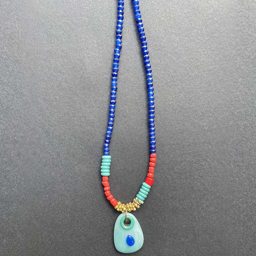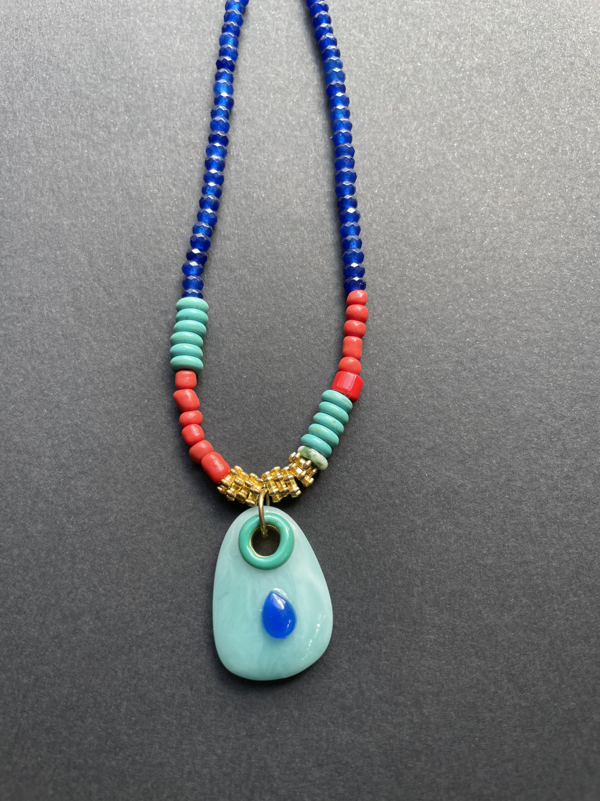 Collier en pierres naturelles aux couleurs intenses : bleu profond, turquoise et corail, orné d’un pendentif doux aux reflets aqua avec une touche bleutée centrale. Un bijou qui rappelle les vagues marines, l’énergie des récifs et la force des éléments.