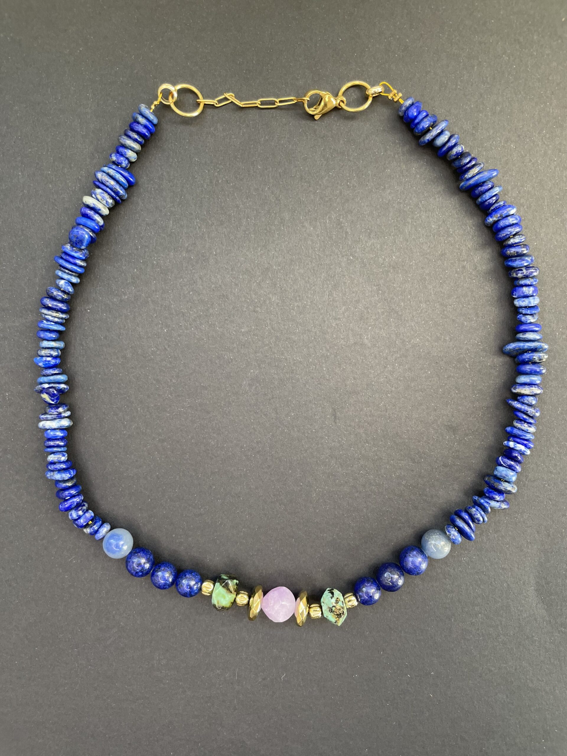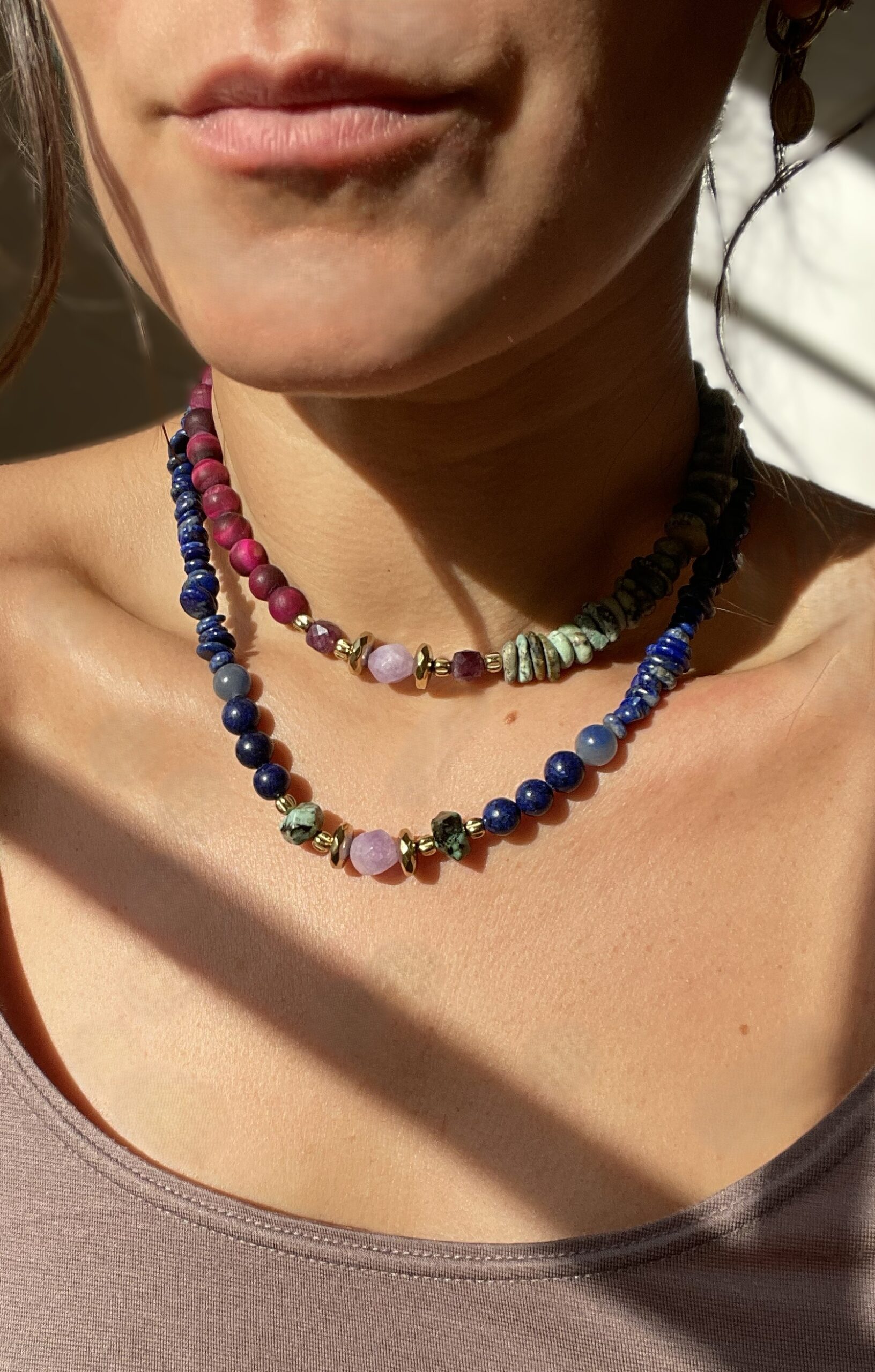 Un collier vibrant composé de perles bleues en pierre naturelle, rehaussées par deux pierres vertes et une pierre rose au centre.