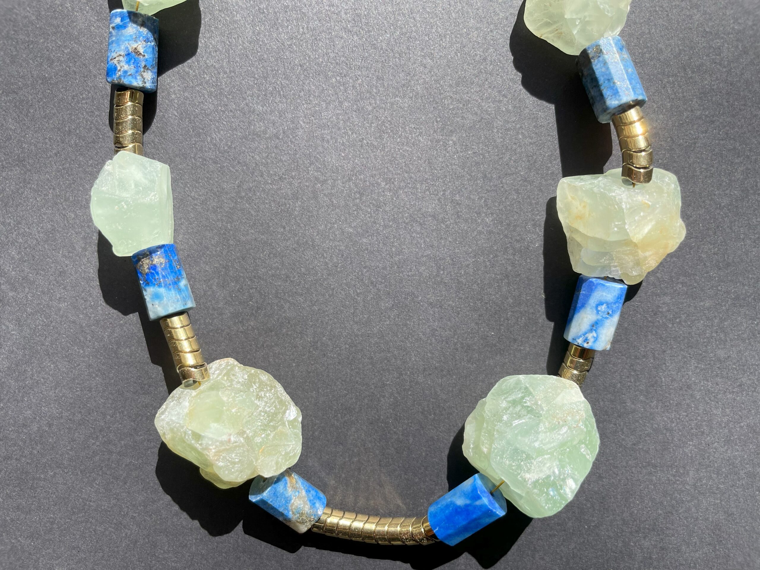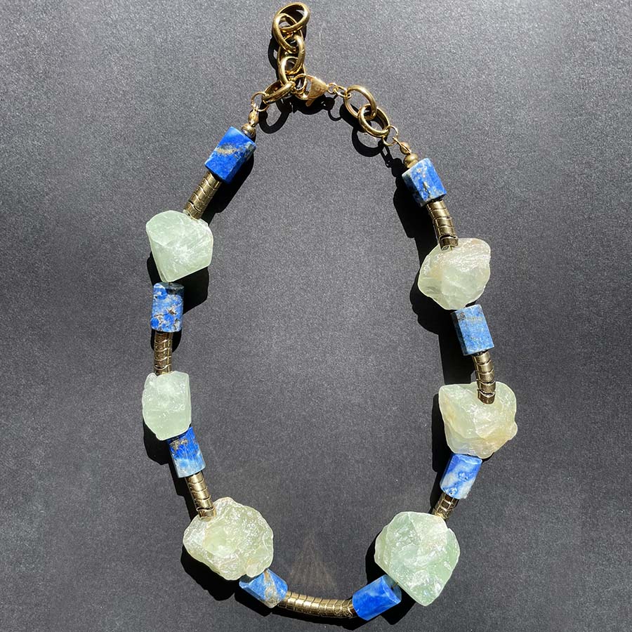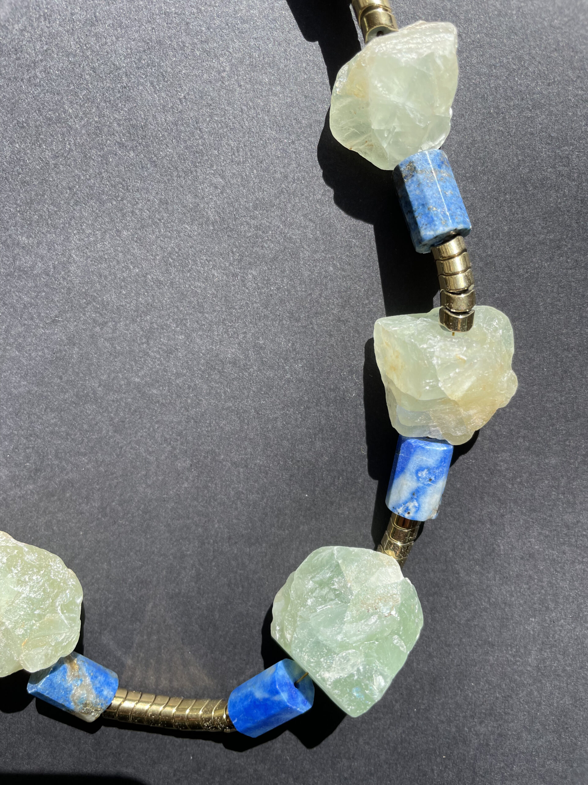 Collier artisanal composé de pierres naturelles brutes vertes associées à des perles de lapis-lazuli. Une pièce vibrante qui allie la fraîcheur des verts et la profondeur des bleus, inspirée par l’énergie des éléments.