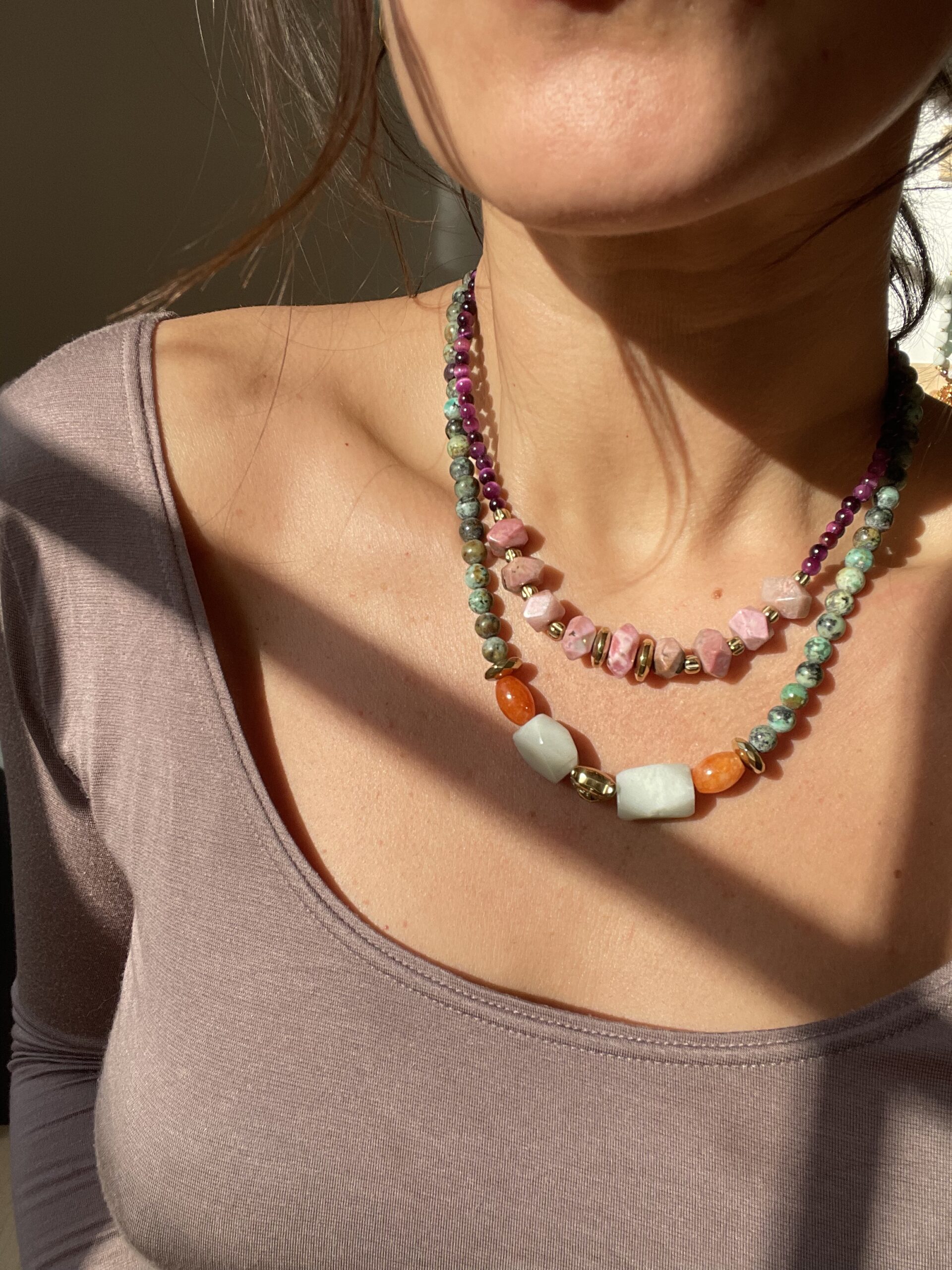 Un collier lumineux composé de perles fuchsia en pierre naturelle et de pierres aux tons rose pêche au centre.