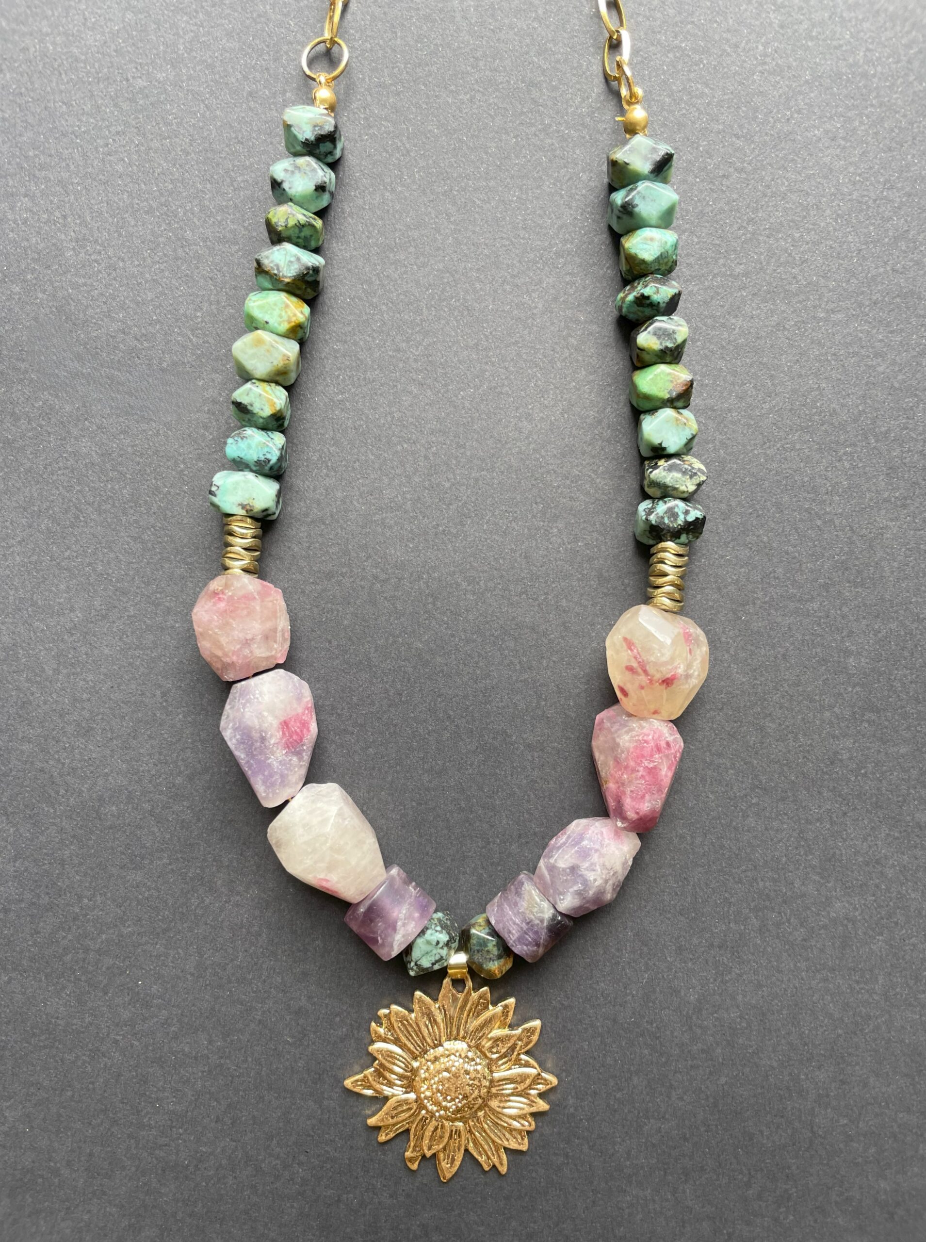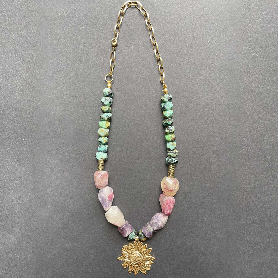 Collier artisanal composé de pierres naturelles aux nuances vertes, violettes et rosées. Orné d’un pendentif doré en forme de soleil, il incarne l’énergie et la chaleur lumineuse des beaux jours.