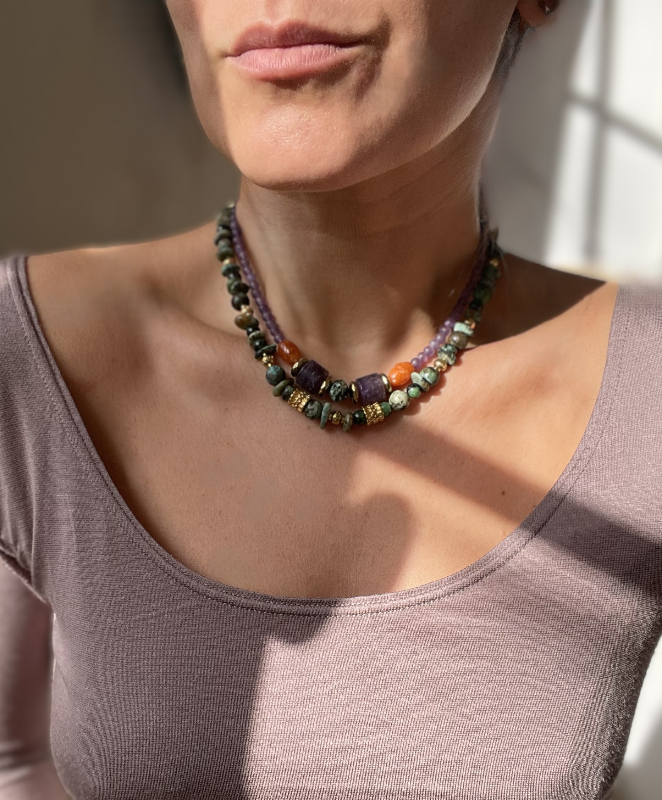 Un collier fin et coloré qui réunit des perles violettes en pierre naturelle, rehaussées par deux touches orangées très lumineuses.