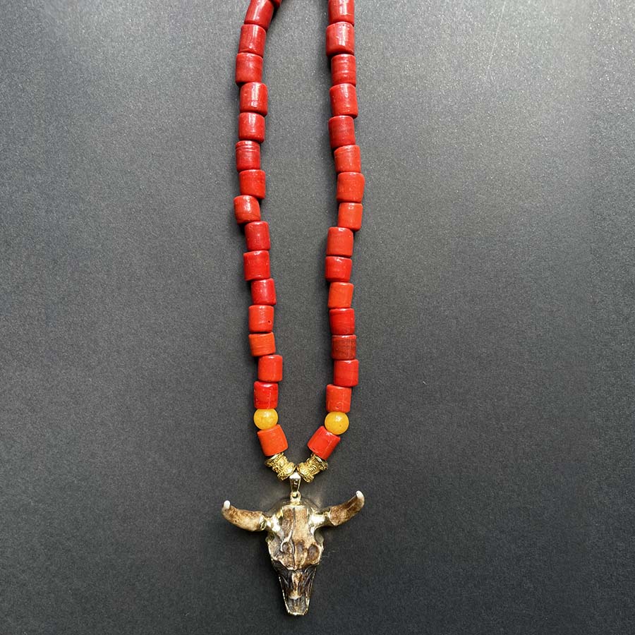 Collier artisanal en pierres naturelles rouges et jaunes, orné d’un pendentif tête de taureau travaillé avec finesse. Une pièce audacieuse et symbolique, reflet de force, de caractère et d’authenticité.
