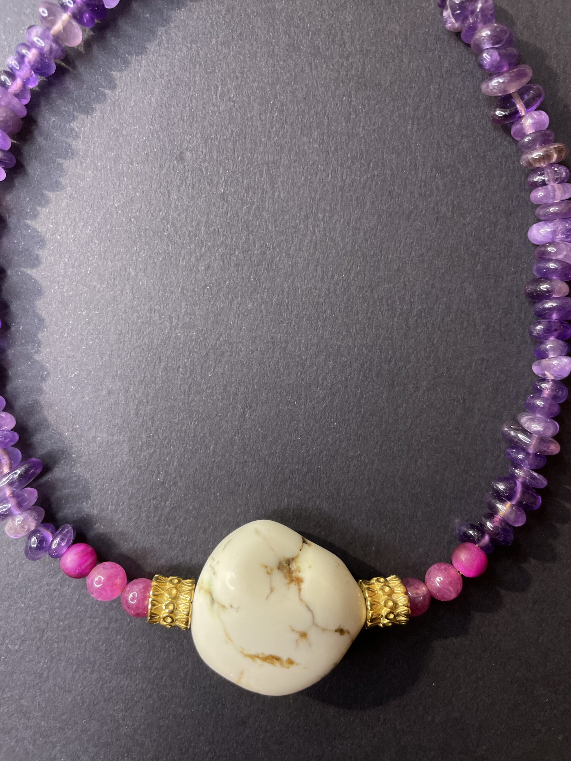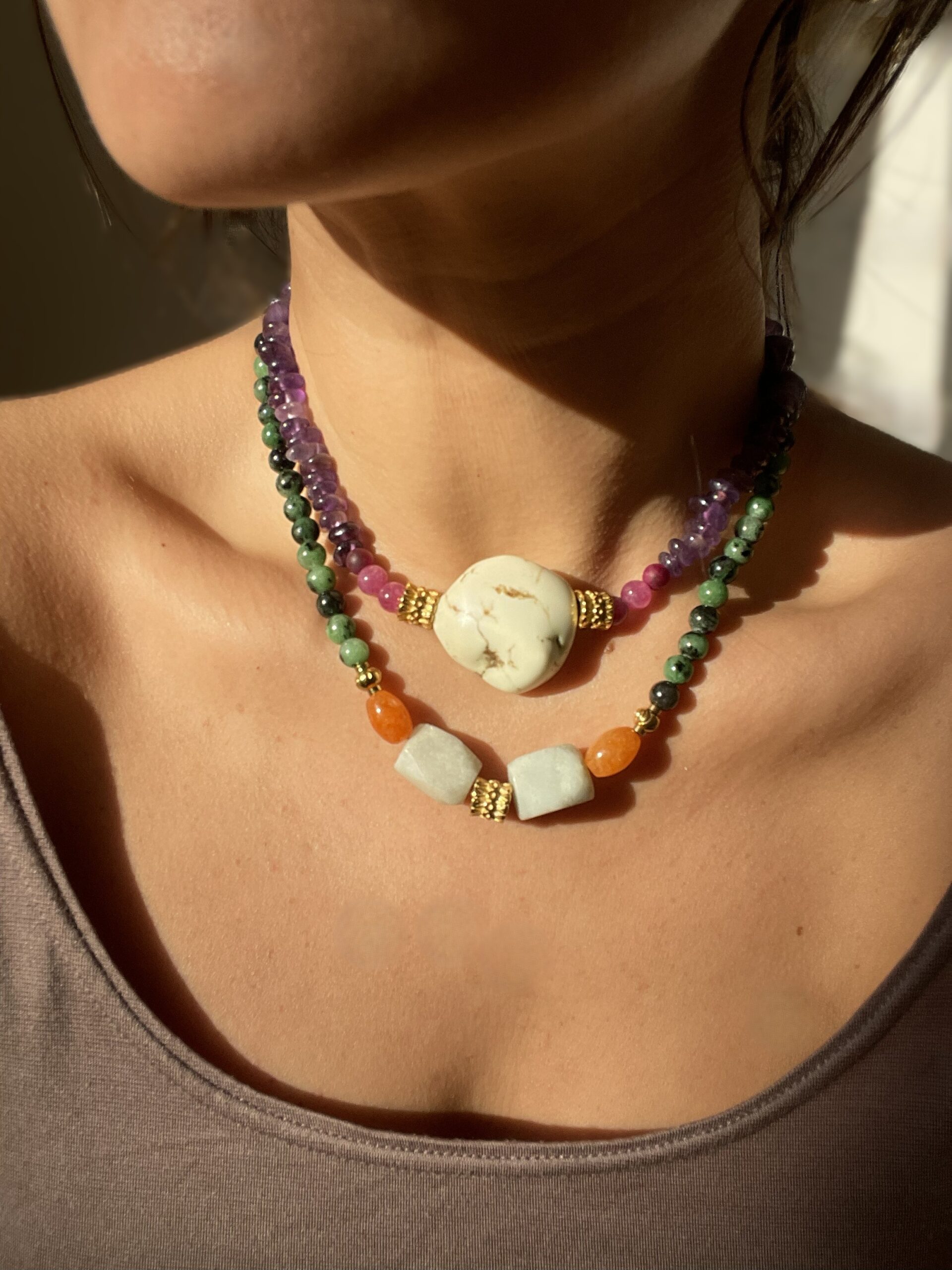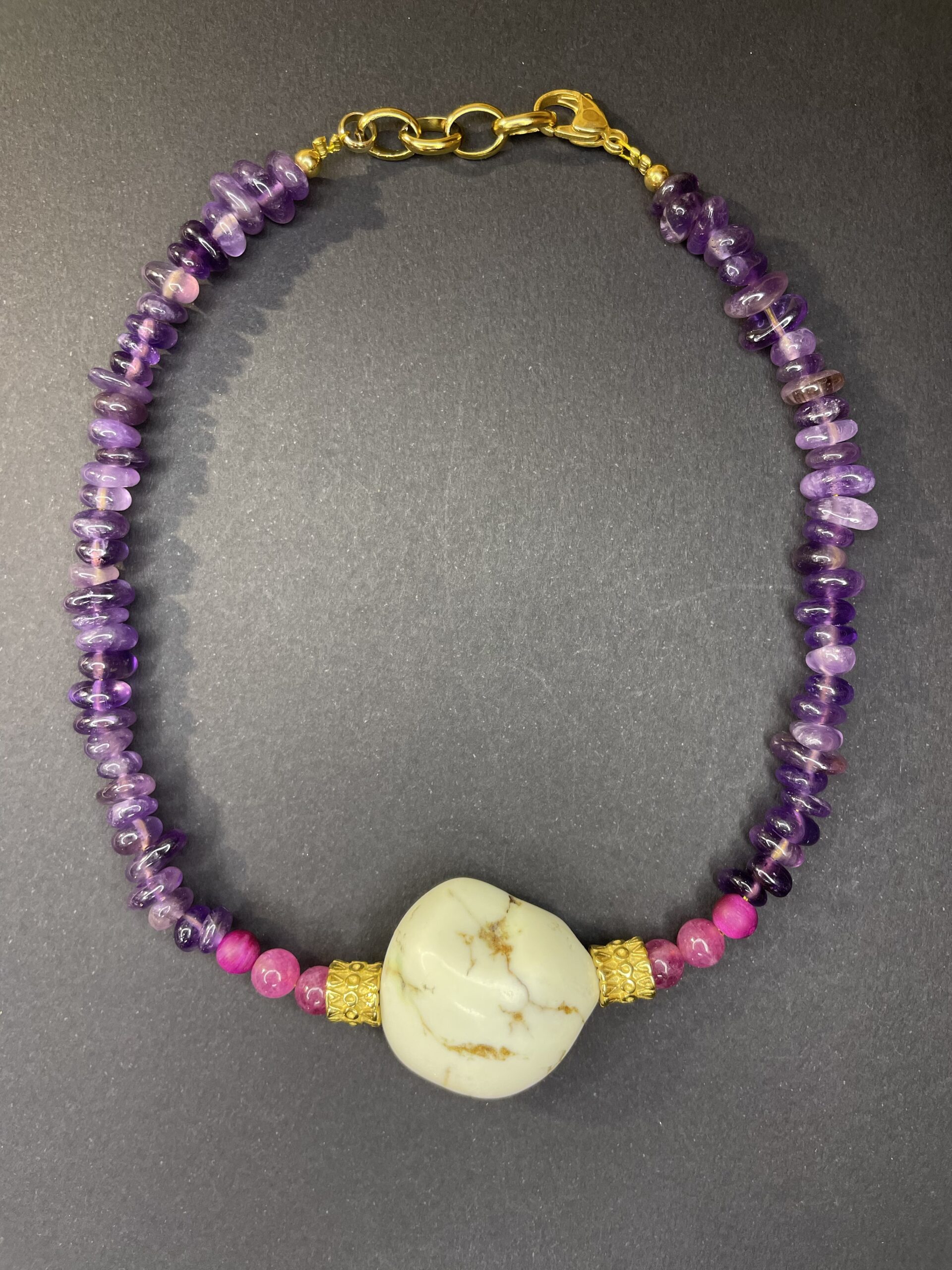 Un collier vibrant qui mélange des perles violettes en pierre naturelle avec une pierre centrale beige douce.