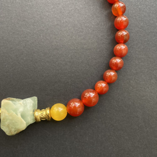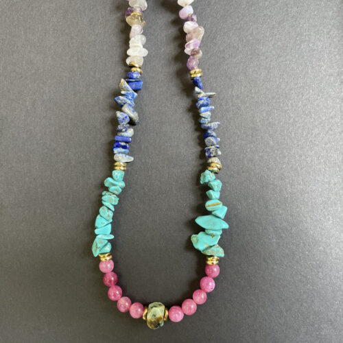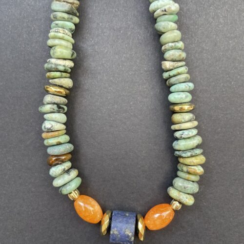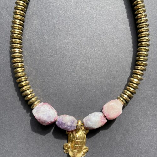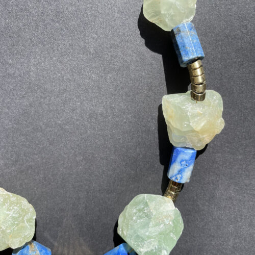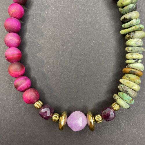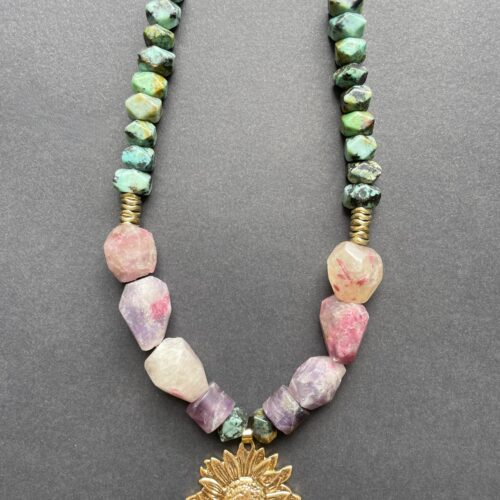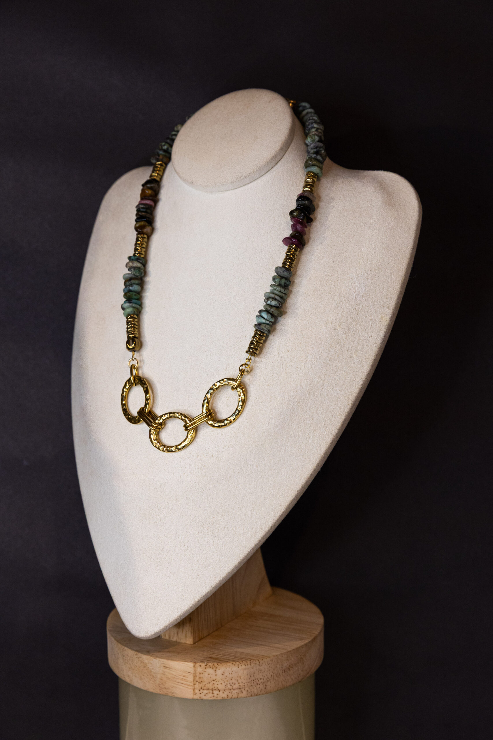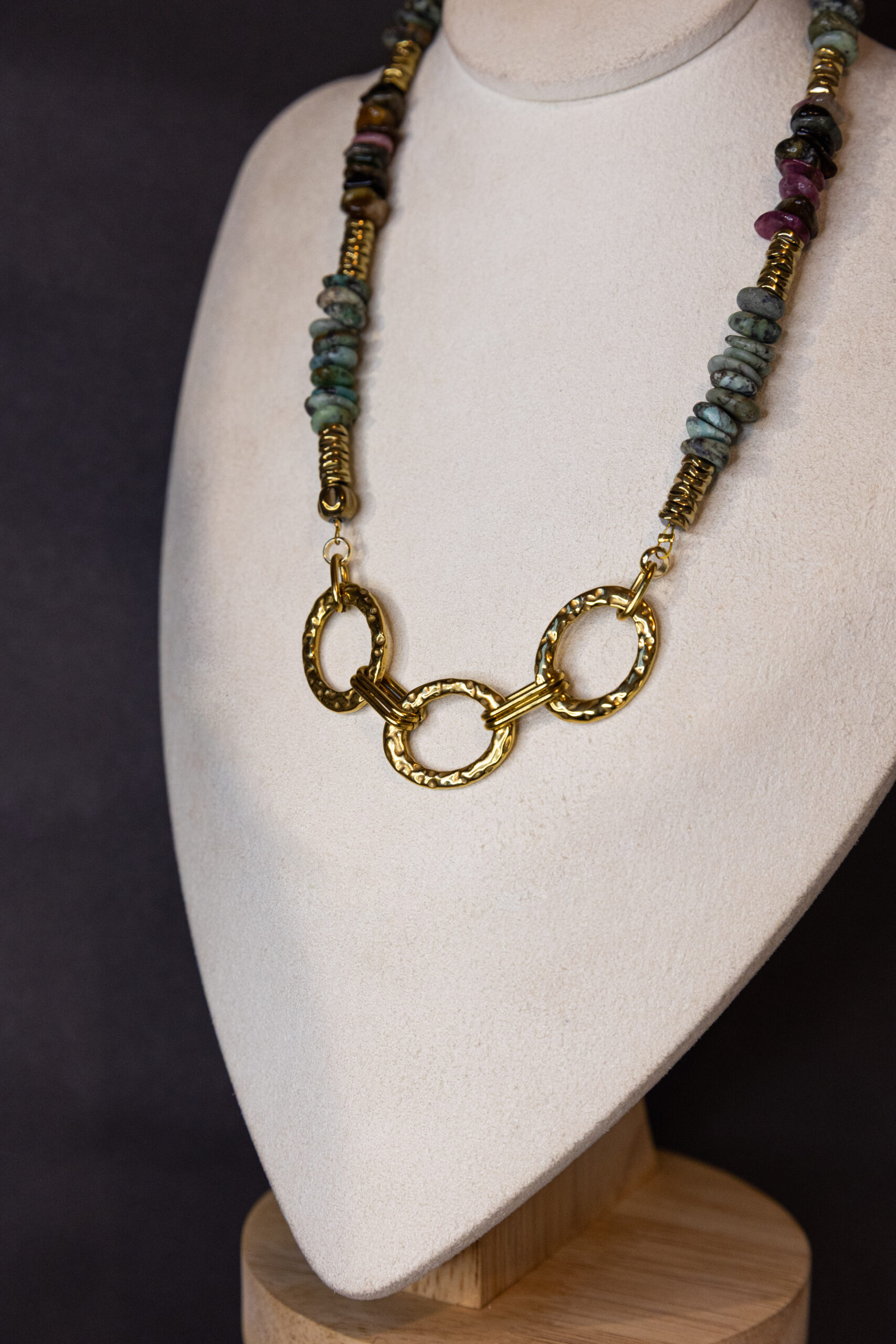 Un collier au caractère affirmé composé de pierres naturelles aux nuances minérales subtiles, mêlant verts patinés, gris profonds et touches rosées.