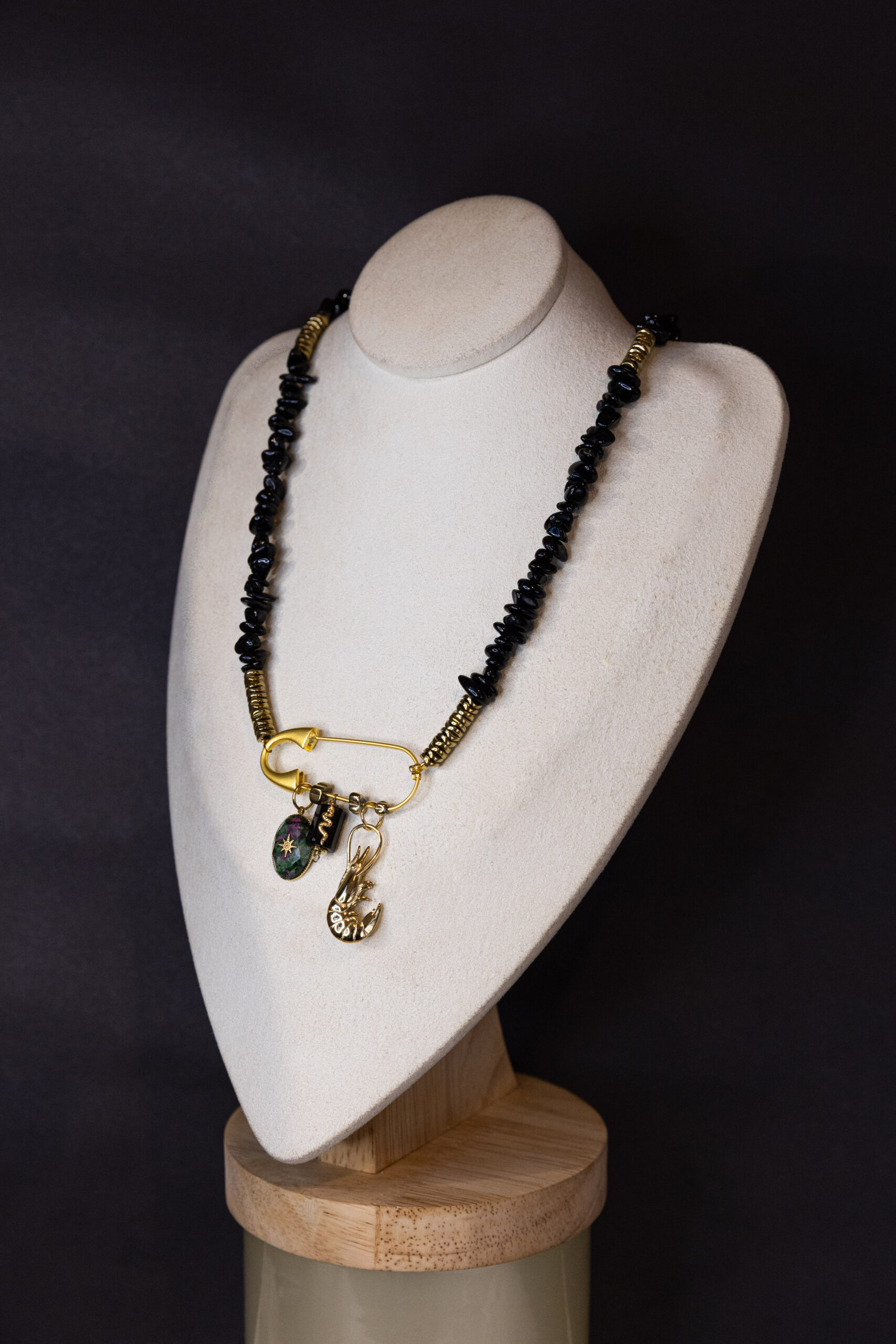 Un collier intense et élégant composé de perles irrégulières en pierres naturelles noires, subtilement rehaussées de détails dorés.